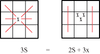 ![]() Infiniti altri possono essere costruiti moltiplicando il quadrato cinese per un qualunque numero a. Ci domandiamo ora se, in questo modo, abbiamo esaurito tutti i possibili quadrati magici o ve ne sono degli altri. Ci domandiamo cioé se esiste un nuovo quadrato magico che non sia un multiplo di quello cinese, un quadrato magico dunque linearmente indipendente da quello. Uno molto semplice viene subito in mente: è quello che ha 1 in tutti i posti. Chiamiamo c il quadrato magico cinese e b quello con tutti 1. A partire da questi possiamo ora costruire altri, tanti altri quadrati magici: ad esempio se calcoliamo il quadrato 2b - c, troviamo un quadrato magico a somma 27. ![]() Abbiamo in questo modo trovato un criterio per costruire tutti i possibili quadrati magici o ve ne sono altri che non possono esprimersi a partire da b e c? In altre parole, esiste un quadrato magico linearmente indipendente da b e c? Permutando la prima e la terza colonna di c troviamo, ovviamente, un altro quadrato magico diciamo a. Se a fosse combinazione lineare di c e b sarebbe ![]() Ma questo è impossibile perché, uguagliando i tre termini della prima riga, si troverebbe il sistema che è chiaramente incompatibile. Ne segue che a è linearmente indipendente da c e b. Possiamo a questo punto costruire infinito a tre (come si diceva nell'800) quadrati magici combinando linearmente i tre trovati. Si può dimostrare, ma non è immediato, che non esistono altri quadrati magici indipendenti da questi e quindi ogni quadrato magico 3x3 si può scrivere nella forma Un altro modo per costruire facilmente dei quadrati magici indipendenti, si basa sulla seguente osservazione: se S è la somma (costante) degli elementi sulle righe, sulle colonne e sulle diagonali, allora l'elemento al centro del quadrato vale S/3. Infatti, se chiamiamo x tale elemento abbiamo che la somma degli elementi sulle due diagonali e di quelli sulla seconda riga vale 3S, d'altra parte questa somma si ottiene sommano la prima e la terza colonna e tre volte x. In definitiva ![]() 3x=S. ![]() Osserviamo che l'ultimo numero da sistemare, che è -1, sistema, come una chiave di volta, sia la diagonale che la terza riga e la terza colonna. Questo fatto, se vogliamo sorprendente, ci permette di costruire facilmente altri due quadrati magici indipendenti da quello, spostando la posizione del 3 al secondo posto e al terzo posto. In definitiva otteniamo i tre quadrati magici linearmente indipendenti. ![]() La loro indipendenza lineare si vede facilmente perché se fosse i tre numeri sulla prima riga sarebbero 3x1, 3x2, 3x3 e questi, essendo la prima riga del quadrato nullo, dovrebbero essere zero il che implica x1 = 0, x2 = 0, x3 = 0. Possiamo anche, considerando sempre la prima riga, scrivere facilmente il quadrato cinese c come loro combinazione lineare: Abbiamo trovato tre quadrati magici linearmente indipendenti e ci domandiamo, come abbiamo fatto per i vettori geometrici, se è possibile trovare un quarto quadrato magico indipendente da quelli. Anche in questo caso la risposta è negativa perché ogni quadrato magico lo possiamo scrivere come loro combinazione lineare. Consideriamo infatti un generico quadrato magico x e supponiamo che 3x1, 3x2, 3x3, siano i numeri che si trovano sulla sua prima riga, cosa questa non restrittiva dato che possiamo dividere per tre i numeri effettivi che si trovano in queste caselle. Costruiamo ora il quadrato magico e dimostriamo che x' = x. Per dimostrare che due quadrati magici sono uguali basterà dimostrare che hanno gli stessi 9 numeri nelle stesse posizioni. Il quadrato x' sulla prima riga ha i numeri 3x1, 3x2, 3x3 come x e inoltre avendo uguale la prima riga, la somma S = 3x1 + 3x2 + 3x3 sarà la stessa per i due quadrati magici. Ne segue, per la proprietà generale dei quadrati magici che abbiamo visto sopra, che il termine centrale vale S/3 per tutti e due i quadrati magici. A questo punto possiamo concludere che i due quadrati magici sono uguali dato che gli altri termini sono univocamente individuati dalla condizione che la somma sulle due diagonali, sulle righe e sulle colonne vale S per entramnbi. Ad esempio l'elemento centrale dell'ultima riga sarà per entrambi la soluzione y dell'equazione